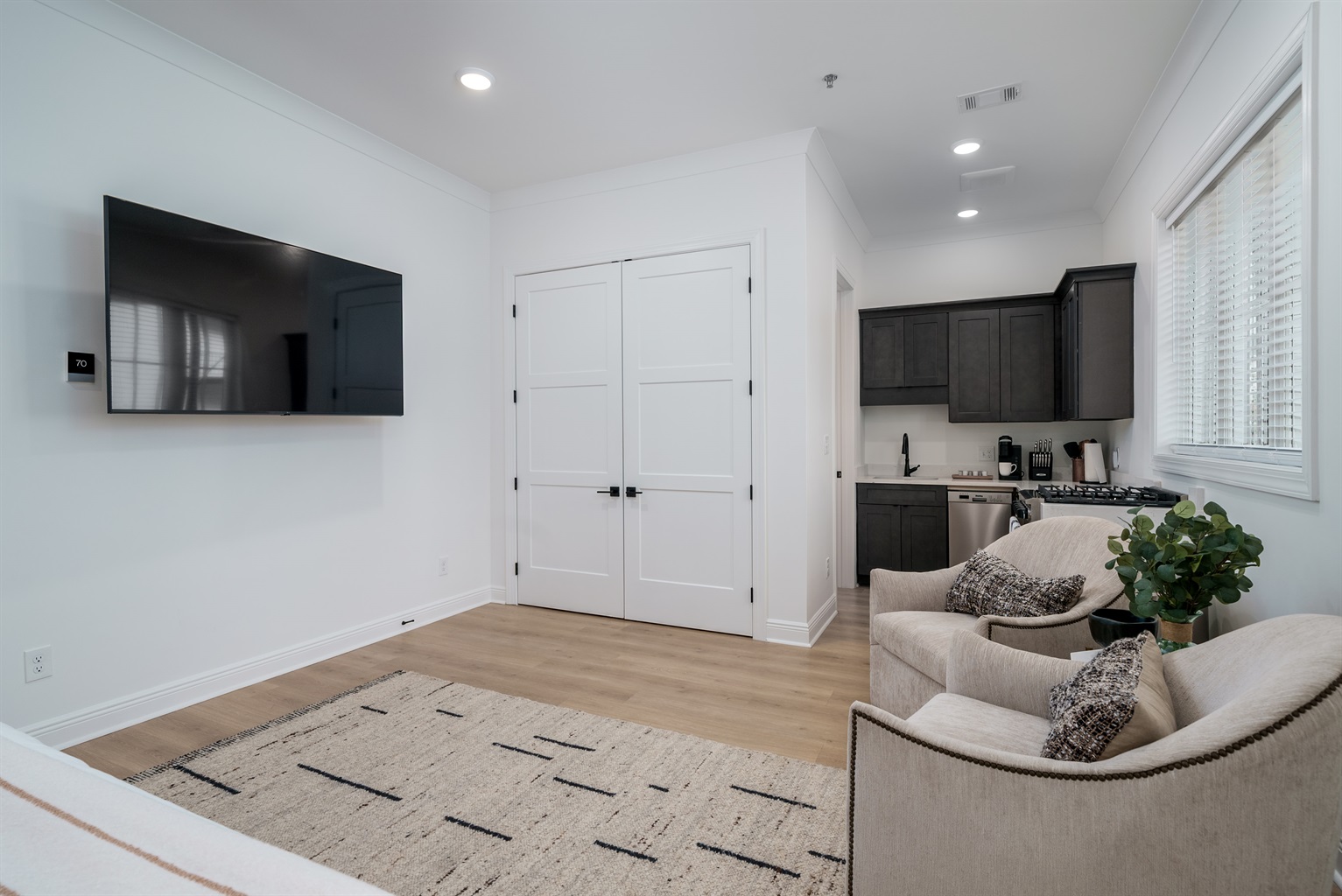 On the entry level, you’ll find a master king suite containing a full luxury kitchenette and full bathroom with a shower. The Game-day garage is located on this level and is the perfect entertainment area. This climate-controlled garage boasts comfy seating, a 65-inch TVs in addition to a Multi-cade with 100's of games. Open the garage to experience the excitement of the Stadium. You’ll also find the laundry room with full washer and dryer located on this level. All rooms on this floor are step-free.