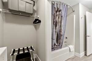 The private master suite boasts a king bed, walk-in closet and en-suite bathroom with shower. Grab bar in to shower.
